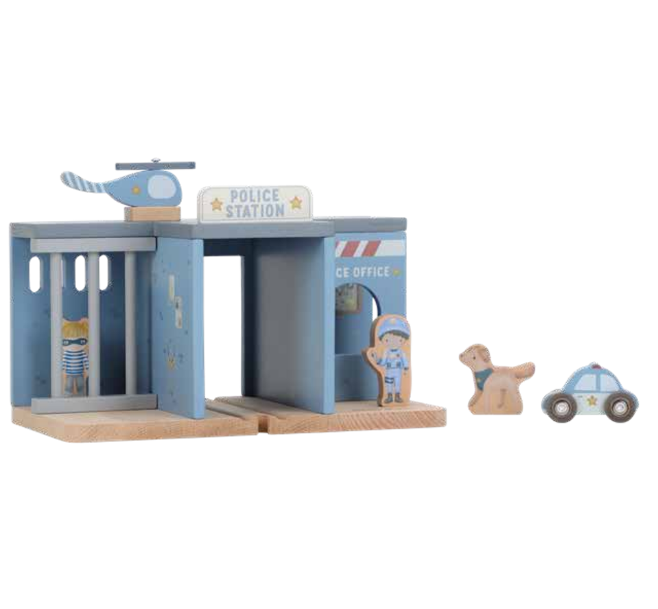 Voleur repéré ! Ce poste de police en bois offre tout le nécessaire pour inventer des scénarios policiers captivants.