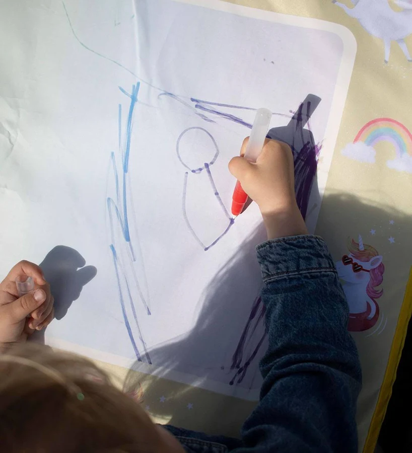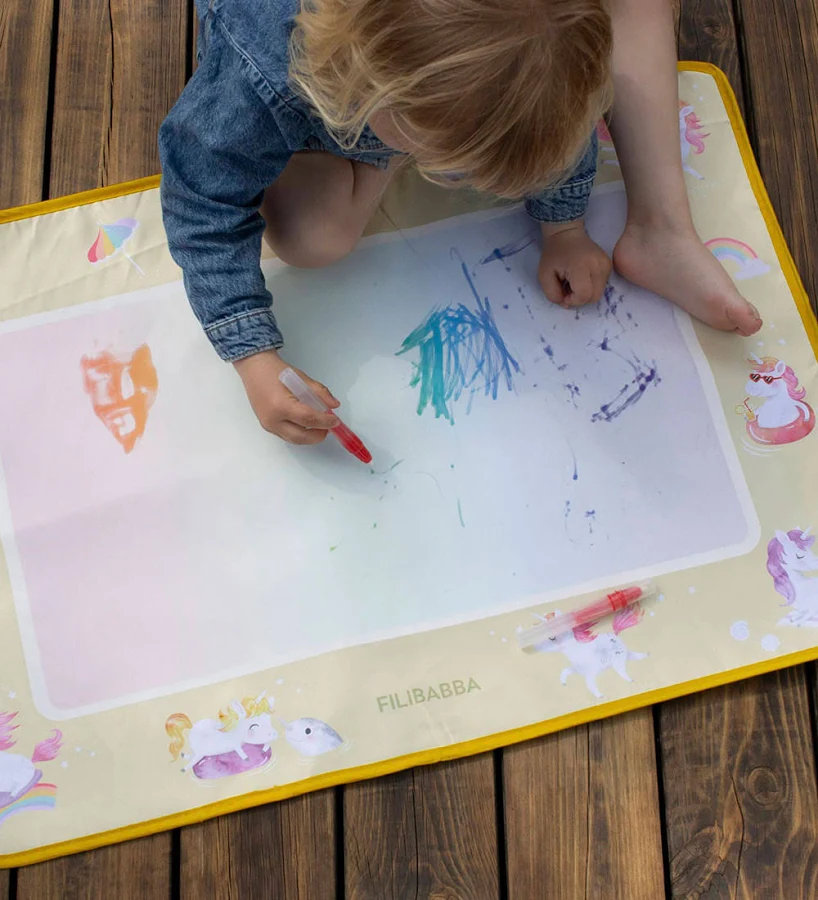 Grâce aux feutres magiques remplis d’eau, les couleurs apparaissent instantanément sur le tapis… sans aucune tache ni risque d’accident. Une fois le dessin terminé, il suffit de laisser sécher : les motifs disparaissent comme par enchantement, pour recommencer à l’infini.